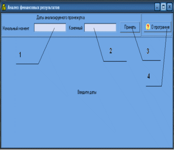 Поле 1 служит для ввода начальной даты анализируемого промежутка. Поле 2 служит для ввода конечной даты анализируемого промежутка. Кнопка 3 "Принять" служит для обработки введенных дат. Если поля введены, после нажатия открываются поля для ввода данных. Кнопка 4 "О программе" выводит окно с данными разработчика.