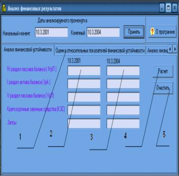 На рабочем окне Закладки 1, служат для переключения между разными областями ввода данных. Столбцы 2 и 3 с полями ввода исходных данных на начальный период и на конечный период соответственно. Кнопка 4 "Расчет" служит для расчета и вывода окна с рассчитанными данными. Кнопка 5 "Очистить" служит для очистки полей ввода при некорректном заполнении.
