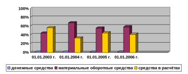Материальные оборотные средства занимают ведущее место, однако и они дали темп снижения с 67,3% до 55,4% в 2004 г. и чуть повысились до 58% в 2005 г., но всё равно ниже на 9,3% с уровнем 2003 г.