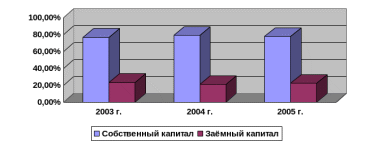 Процентное соотношение собственного и заёмного капитала за 2003 – 2005 гг. по отношению ко всему капиталу