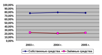 Для наглядности построим график соотношения собственных и заёмных средств в % к имуществу в 2003 – 2005 гг. – рисунок 2.4.