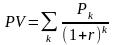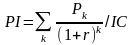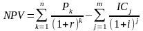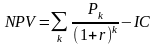Допустим, делается прогноз, что инвестиция (IC) будет генерировать в течение n лет, годовые доходы в размере P1, P2, ..., Рn. Общая накопленная величина дисконтированных доходов (PV) и чистый приведенный эффект (NPV) соответственно рассчитываются по формулам: