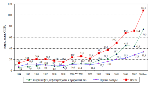 Экспорт товаров увеличился в полтора раза и составил 108,1 млрд. долл. (в январе-марте 2007 года - 71,8 млрд. долл). Стоимость поставок за рубеж сырой нефти возросла на 16,3 млрд. долл., нефтепродуктов - на 6,8 млрд. долл., природного газа - на 7,4 млрд. долл. Экспорт прочих товаров увеличился на 21,2% (черных и цветных металлов - на 12,2 процента).