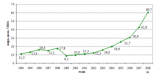 Рис 3.1 Экспорт товаров Российской Федерации в I кварталах 1994-2008 годов (по методологии платежного баланса)