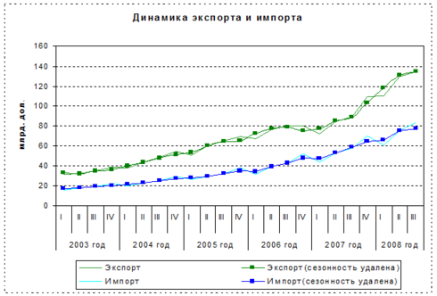 На основе статистики Банка России можно заключить, что в третьем квартале 2008 г. стоимость экспорта поднялась на 4,6% по сравнению с предыдущим кварталом (с исключенной сезонностью), что было поддержано ростом цен на нефть. При этом, в помесячном выражении (без сезонности), в сентябре наблюдалось снижение на 2,7%.