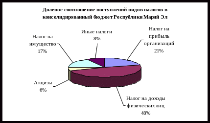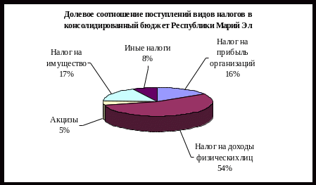Далее рассмотрим долевое соотношения поступлений налогов в консолидированный бюджет РМЭ в 2009 году (рис.5).