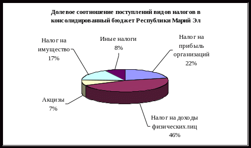 Рис.3. Долевое соотношение поступлений видов налогов в консолидированный бюджет РМЭ в 2007 году