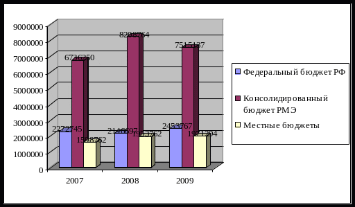 Как видно из данной таблицы, консолидированный бюджет Марий Эл по доходам за 2007 исполнен в сумме 6736 млн. руб., в 2008 году - в сумме 8208 млн. руб., а в 2009 году - в сумме 7515 млн. руб., что составило 111,6% по отношению к 2007 году.
