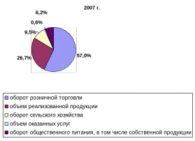 Диаграмма показывает, что в 2007 году наибольший удельный вес в общем обороте составляет оборот розничной торговли (57,0 %), затем следует объём выпускаемой и реализованной продукции (26,7%), далее - оборот сельского хозяйства (9,5 %), оборот общественного питания – (6,2 %) и объём оказанных услуг (0,6 %).
