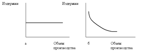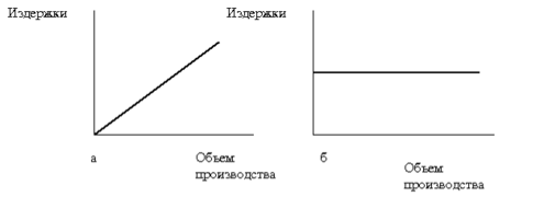 К переменным обычно относят затраты на сырье и материалы, топливо, энергию, транспортные услуги, часть трудовых ресурсов, т.е. те издержки, уровень которых изменяется с изменением объема производства (рис. 1а).