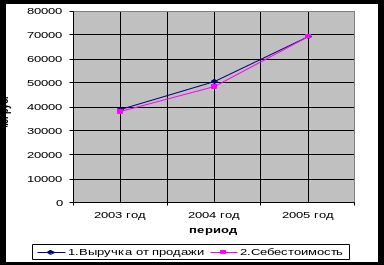Рис.2 Взаимосвязь изменение выручки от продажи и себестоимости проданных товаров, продукции, работ, услуг за 2003-2005 гг.