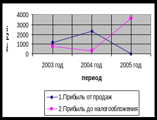Рис. 3 Изменение прибыли от продаж и прибыли до налогообложения за 2003-2005 гг.