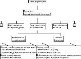 Организационная структура системы управления финансами хозяйствующего субъекта, а также ее кадровый состав могут быть построены различными способами в зависимости от размеров предприятия и вида его деятельности. Для крупной компании наиболее характерно обособление специальной службы, руководимой вице-президентом по финансам (финансовым директором) и, как правило, включающей бухгалтерию и финансовый отдел. На небольших предприятиях роль финансового менеджера обычно выполняет главный бухгалтер.