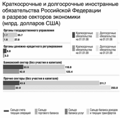 Рис. 1.4 – Краткосрочные и долгосрочные иностранные обязательства Российской Федерации в разрезе секторов экономики (млрд. долларов США)