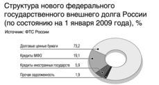 По состоянию на 1 января 2009 года новый суверенный российский долг составил 23,6 млрд. долларов США. На ценные бумаги, номинированные в иностранной валюте, приходилось 17,3 млрд. долларов США (73,2% нового российского долга); на кредиты международных финансовых организаций - 4,5 млрд. долларов США (19,1%); на задолженность перед прочими кредиторами - 1,4 млрд. долларов США (5,9%); на остальные категории - 0,5 млрд. долларов США (1,9%).