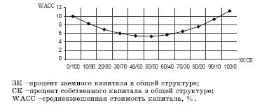 Рис. 3.4 – Зависимость средневзвешенной стоимости капитала от соотношения собственных и заемных средств