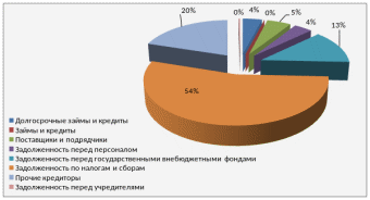 Тем не менее, необходимо отметить, что в течение всего анализируемого периода большую часть заемных средств занимает именно задолженность по налогам и сборам, что отрицательно характеризует структуру заемного капитала. Очень незначительна задолженность перед поставщиками и подрядчиками – это можно характеризовать как положительный фактор, так как отсутствие задолженности перед поставщиками повышает уровень доверия к фирме и появляется возможность получения коммерческого или товарного кредита.