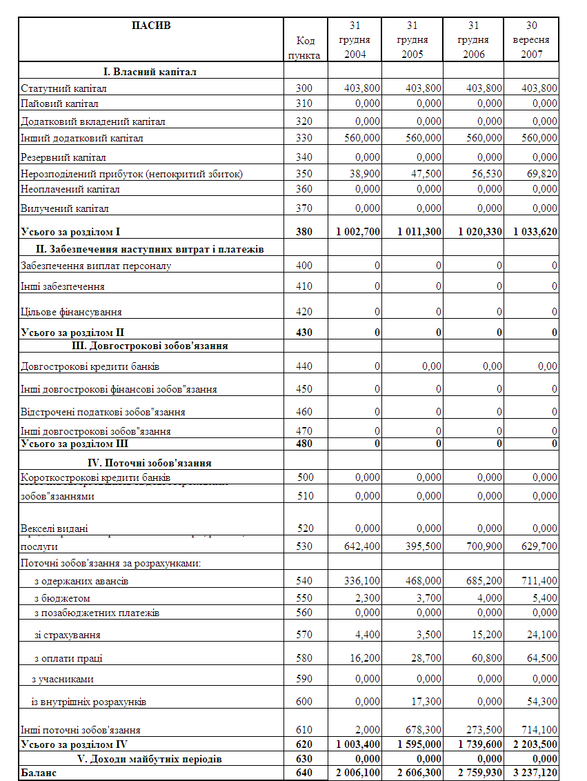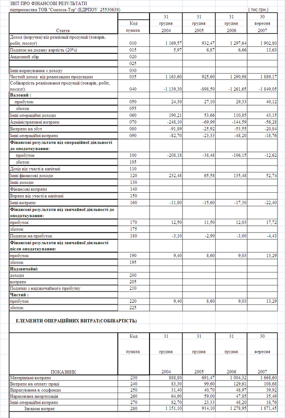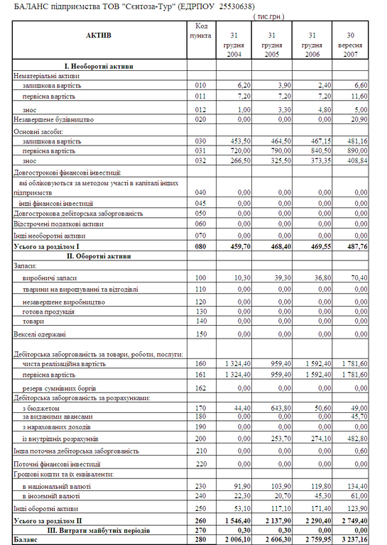 Баланси та звіти про фінансові результати ТОВ «Сєнтоза-Тур» за 2004 -2007 роки