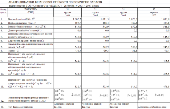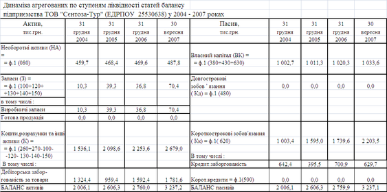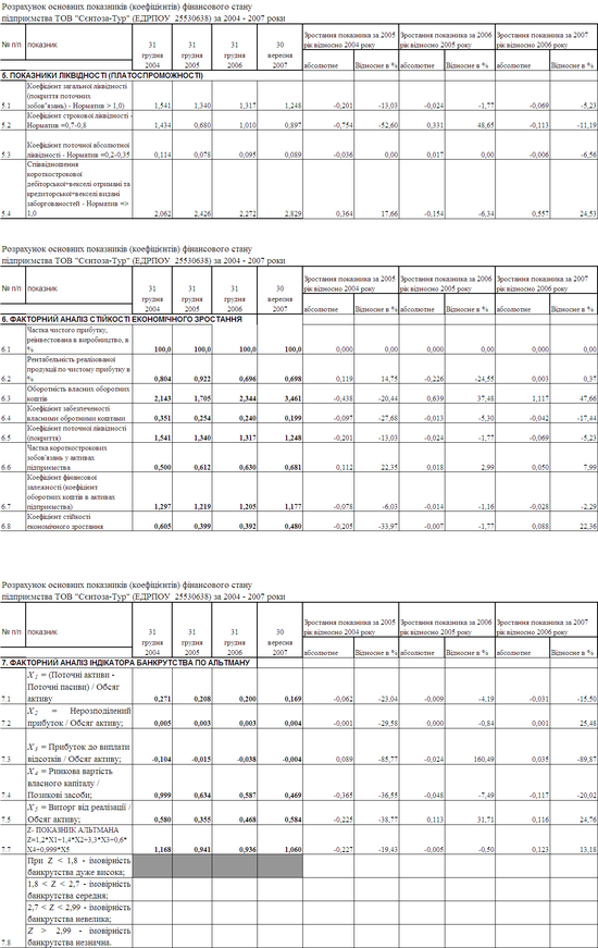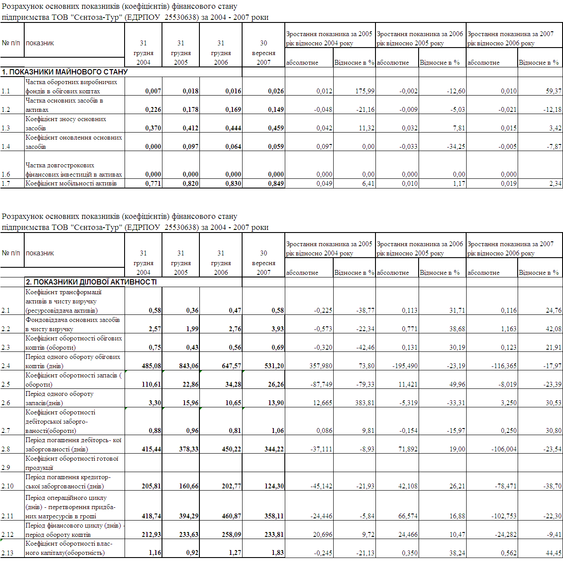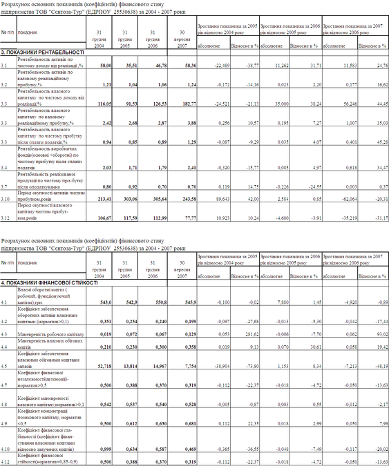 Розрахунок показників фінансового стану ТОВ «Сєнтоза-Тур» за 2004 -2007 роки