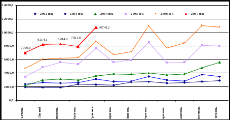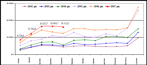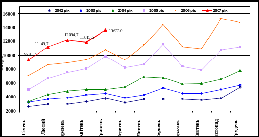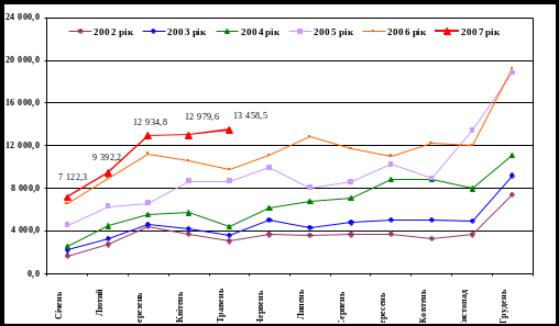 Графік 2 Динаміка щомісячних податкових надходжень державного бюджету в 2002 – 2007 роках