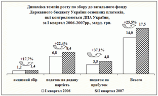 Збір до загального фонду державного бюджету за І квартал 2007 року склав 17,5 млрд.грн., що на 3,6 млрд.грн., або на 25,5 відс., більше, ніж у І кварталі 2006 року. Бюджетний розпис виконано на 102,9 відс., додатково одержано 488,9 млн.грн.