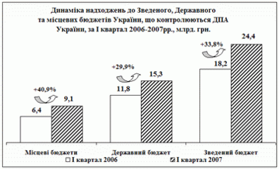 У І кварталі 2007 року до Зведеного бюджету України надійшло 24,4 млрд.грн., що на 6,2млрд.грн., або на 33,8 відс., більше, ніж за Іквартал2006року, в т.ч. до місцевих бюджетів надійшло 9,1млрд.грн., що на 2,6 млрд.грн., або на 40,9 відс., більше минулорічних надходжень.