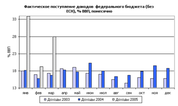 Доходы федерального бюджета в январе-марте 2005 года составили, по предварительным данным, 28,3% ВВП. Без учета доли ЕСН, зачисляемой в федеральный бюджет, в бюджет поступили доходы в объеме 26,9% ВВП, что на 10,1% ВВП больше, чем за тот же период прошлого года. В помесячной динамике объемы доходов также оказались значительно выше, чем в прошлом году. Превышение было обеспечено за счет значительного увеличения налоговых доходов (в 1 квартале на 5,3% ВВП), таможенных платежей (на 2,8% ВВП), поступлению дополнительных безвозмездных перечислений из бюджетов Тюменской области и Ханты-Мансийского АО (1,9% ВВП) а также снижения по сравнению с январем-мартом прошлого года поступлений в федеральный бюджет ЕСН на 1,3% ВВП.
