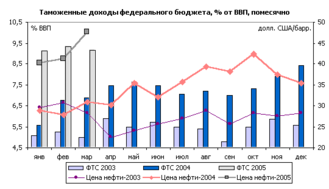 Таможенные доходы в 1 квартале увеличились по сравнению с аналогичным периодом прошлого года на 2,8% ВВП до 9,2% ВВП. Наибольший вклад внес рост экспортных пошлин, в первую очередь – на нефть. Основным значимым фактором, как уже было отмечено, стал рост мировых цен на нефть и, следовательно, увеличение базовых цен для исчисления пошлин. Другой причиной является пересмотр с августа 2004 года порядка определения экспортных пошлин на нефть. В частности, при цене на нефть выше 25 долл. США/баррель пошлина была увеличена с 40% до 65% прироста расчетной цены над этим уровнем. В результате действия перечисленных факторов (рост базы налогообложения и рост ставок пошлин) в начале текущего года значение пошлин оказалось существенно выше, чем в начале прошлого года (в частности, в январе 2005 ставка составила 101 долл. США, а в феврале-марте – 83 долл. США за тонну против, соответственно, 31 долл. и 34 долл. в январе и феврале-марте 2004 года).