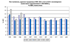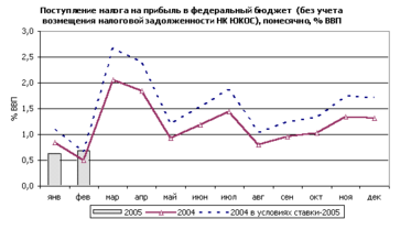 В январе-феврале доходы составили 27,7% ВВП, а без учета ЕСН – 26,3% ВВП, что на 9,5% ВВП больше, чем за тот же период прошлого года. Согласно проведенному анализу, основным фактором увеличения налоговых доходов федерального бюджета в январе-феврале по сравнению с аналогичным периодом предыдущего года стало поступление в бюджет дополнительных налогов и сборов, начисленных по результатам налоговых проверок НК "ЮКОС", включая средства, средств, полученных от продажи НК "Юганскнефтегаз". Влияние этого фактора на налоговые доходы оценивается в 3,6% ВВП. Вторым по значимости фактором стал рост мировых цен на нефть: средняя цена в январе-феврале составила 40,6 долл. США/баррель против 28,4 долл. США в прошлом. Этот фактор дал прирост доходов федерального бюджета в первые два месяца года еще на 2,1% ВВП. Третий по значимости фактор – это увеличение с 2005 года ставки НДПИ и изменение с августа 2004 года порядка определения экспортных пошлин на нефть. Влияние этого фактора на рост доходов составило 1,2% ВВП. Изменение порядка распределения налогов между бюджетами различных уровней способствовало росту налоговых поступлений в федеральный бюджет на 0,5% ВВП, из которых 0,2% дало увеличение федеральной ставки налога на прибыль с 5% до 6,5% и 0,3% – увеличение доли НДПИ на нефть, зачисляемой в федеральный бюджет, до 95%.