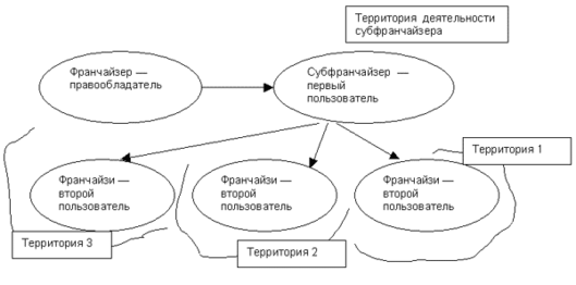 2. Суб-франчайзинг — трехуровневая система франчайзинговых отношений, подобная региональной схеме. Основное отличие — иная организация потока платежей: он становится последовательным, а непосредственная связь франчайзи с головной компанией утрачивается практически полностью. Фактически суб-франчайзи становится франчайзером на своей территории, и франчайзи зависит уже от его долгосрочной поддержки (см. рис. 1.4) [14].