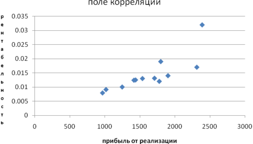 Рисунок 2 – Поле корреляционной зависимости рентабельности и прибыли от реализации