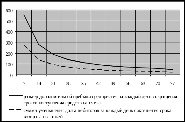 Предприятие, принимающее меры по сокращению срока возврата платежей, при эффективном использовании их в обороте будет иметь дополнительный источник увеличения прибыли в виде отдачи от вложений в оборот досрочно полученных сумм. Сокращение сроков денежных поступлений также сократит потребность в получении кредитов в банке. Однако меры по ускорению расчётов требуют определённых затрат и важно, чтобы доходы, полученные от этих мер, превышали сумму таких затрат. В противном случае указанные меры не только не улучшат результата, но и принесут убыток.