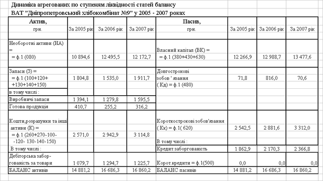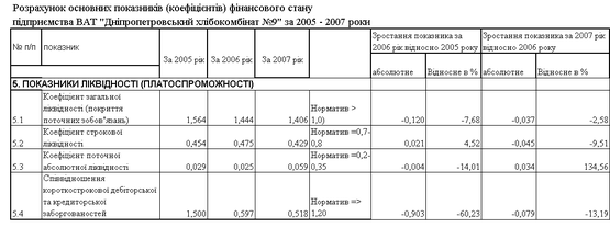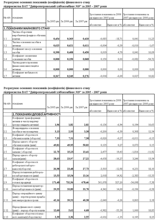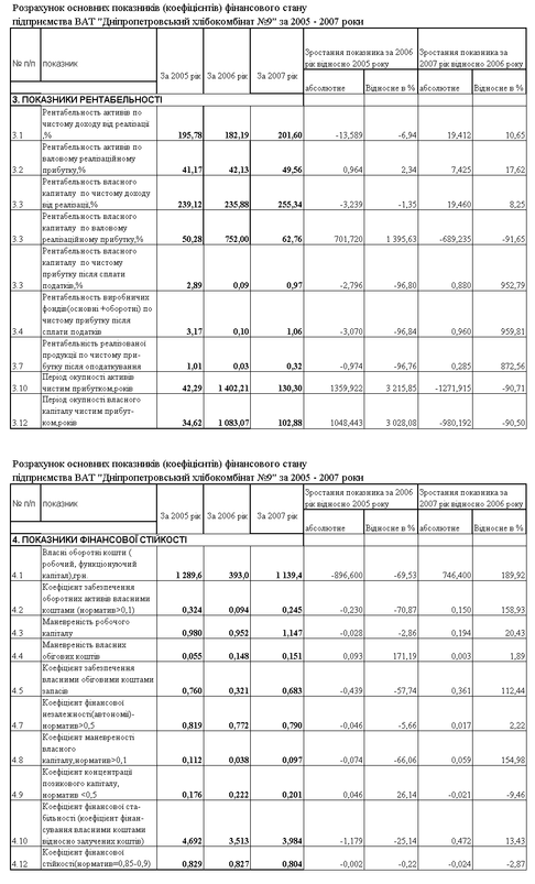 Результати розрахунків показників фінансової діяльності ВАТ „Дніпропетровський хлібокомбінат №9” за 2005 -2007 роки