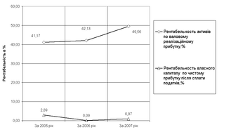 Аналіз рентабельності активів та власного капіталу ВАТ “Дніпропетровський хлібозавод №9” показує (Додаток Е), що його діяльність може бути охарактеризована наступними показниками(рис.2.5):