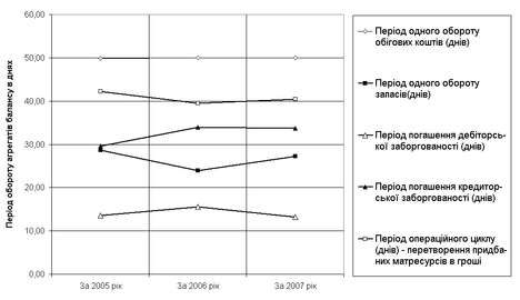 Як показано на графіках рис.2.6 за період з 2005 по 2007 рік період обороту характерних грошових агрегатів знаходиться в стабільному діапазоні, що свідчить про відлажений процес постачання сировини та реалізації продукції заводу.