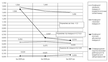 - значення коефіцієнта строкової ліквідності знаходилось в діапазоні 0,45 (2005 рік), 0,47(2006 рік) та 0,43(2007 рік), тобто не задовольняє нормативні вимоги (0,7-0,8) для рівня строкової ліквідності підприємства;