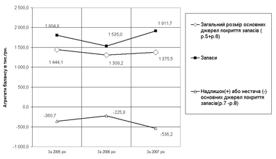 Як показують результати розрахунків коефіцієнтів покриття запасів (Додаток Е, рис.2.7), у 2005 - 2007 роках загальних джерел покриття запасів було недостатньо, тобто підприємство має постійні проблеми з пошуком джерел покриття виробничих запасів за рахунок власного оборотного капіталу.