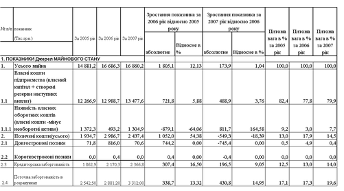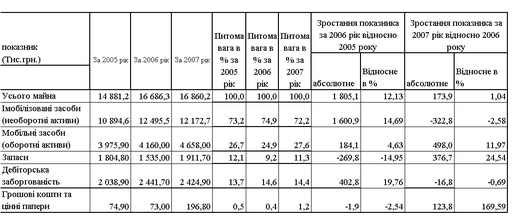 - валюта активів балансу у 2006 році зросла на + 12,1 % відносно рівня 2005 року, а у 2007 році ще зросла на + 1,4 % відносно рівня 2006 року, таким чином валюта балансу за два роки зросла з 14,9 млн.грн. до 16,9 млн.грн..;