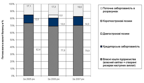 структурна частка кредиторської заборгованості наростає з рівня 12,5% у 2005 році до рівня 14,0% у 2007 році;