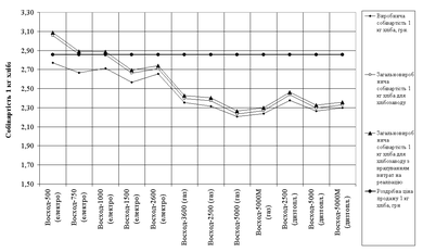 В таблицях Додатку К наведені результати розрахунків показників бізнес-планів впровадження нових видів хлібопекарних роторних печей „Муссон-Ротор”, які працюють на електроенергії, на газі та на дизельному пальному. На рис. 3.2 наведені результати розрахунків собівартості 1 кг хліба на різних типах печей з різними рівнями продуктивності. Розраховувалися три види собівартості - виробнича, цехова та загальна по підприємству. Реалізаційна ціна 1 кг хліба у всіх варіантах приймалася на рівні 2008 року – 2,86 грн./кг.