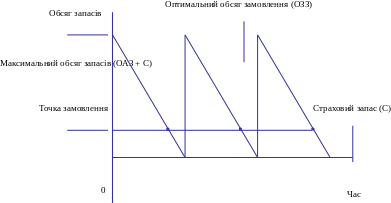 Якщо підприємство підтримує деякий рівень страхового запасу на складі (С), коливання залишку запасів буде визначатись інтервалом {С, ООЗ + С}, середній залишок – величиною (ООЗ + С) : 2 (рис. 1.5), а точка замовлення визначатиме рівень запасів, при якому потрібно організувати їх поповнення.