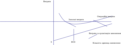 Це свідчить про існування деякого оптимального для підприємства обсягу товарно-матеріальних запасів і відповідно оптимального обсягу замовлення, при якому витрати на утримання запасів будуть мінімальними. Обсяг запасів, менший від оптимального, призводить до збільшення витрат і зростання ризику зупинки виробництва; обсяг запасів, що перевищує оптимальний, також призводить до збільшення витрат на зберігання виробничих запасів, але вже в результаті виникнення надлишкових запасів та знерухомлення грошових коштів.