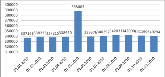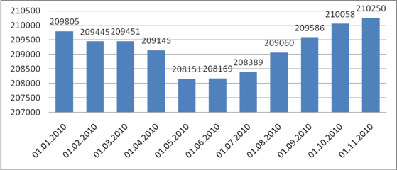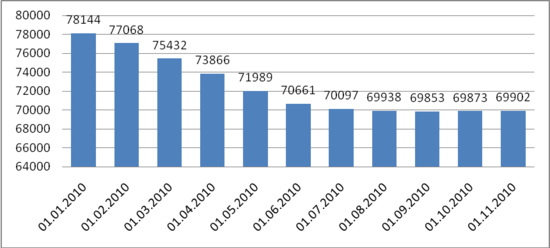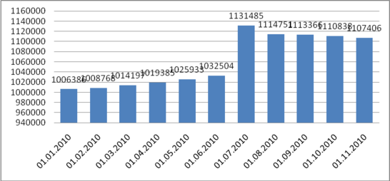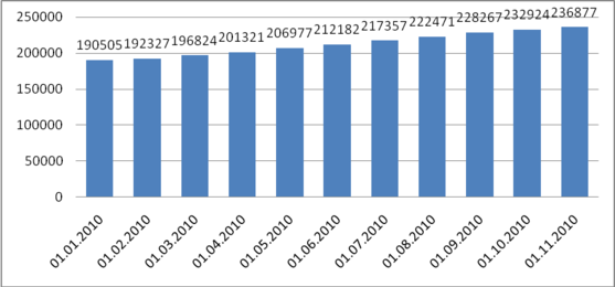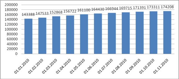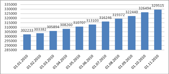 Динамика количества вкладчиков фонда по обязательным пенсионным взносам за 11 месяцев 2010 года представлена на Рисунке 4.