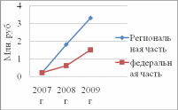 Анализируя динамику видно, что сумма налога на прибыль исчисленная в 2009г., по сравнению с 2008г., увеличилась на 2157447 руб. Это связано с ростом налоговой базы в 2009г., (на 8989365руб.) и соответственно ростом доходов предприятия. Посмотрим также диаграмму для сравнения перечислений налога на прибыль ОАО «Курская фабрика технических тканей» за 2007-2009 гг. в бюджеты разных уровней (рис. 2)
