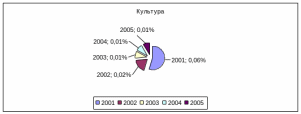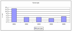 Видатки на культуру і мистецтво по Бабушкінському району представлені лише видатками на музичну школу району. Тенденція до зростання цих видатків є незначної, а в порівнянні з 2001роком, ці видатки навіть скоротилися (2001р- 12,7тис.грн.,а у 2005р. – 5,2тис.грн.) (рис.2.10.).У структурі видатків району вони займають найменшу частину, приблизно 0,02 % в середньому.(рис.2.11)