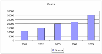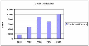 . За 2005 рік сума соціальних видатків склала 44076,9 тис.грн. Слід зазначити, що ці соціальні видатки мали зростаючу тенденцію протягом 2001- 2005років.( додаток В, рис. 2.7.,рис.2.8.). Лише видатки на культуру зменшувалися (2001р.-12,7тис.грн., 2004р.-3,3тис.грн.,і тільки у 2005 році вони дещо підвищилися – 5,2 тис.грн.).