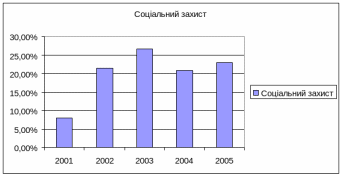 Видатки на соціальний захист і соціальне забезпечення району займають друге місце за своїми показниками у структурі видатків району.(.додаток В , рис.2.14.,рис.2.15.).Протягом п’яти років ці видатки мають зростаючу тенденцію, лише у 2004 році цей показник дещо знизився з 8865,4тис.грн.у 2003р.,до 7002,6тис.грн. В 2005р. фінансування цих видатків з бюджету району склало 10080,6тис.грн.