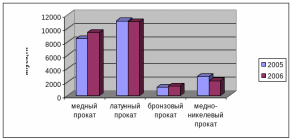 Наибольший удельный вес в выпуске ЗАО «Кольчугцветмет» занимает латунный прокат как в 2005 году, так и в 2006 году, наименьший удельный вес занимает выпуск бронзового проката.