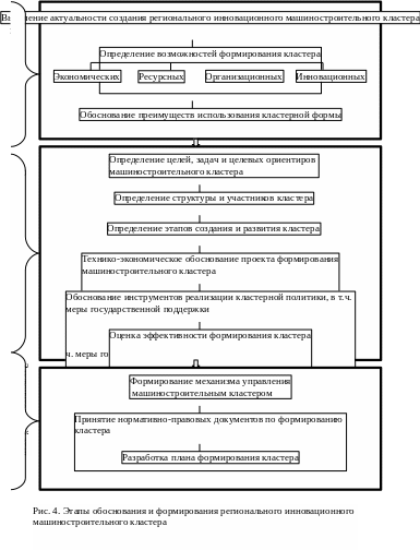 На основании изложенного можно предложить следующие этапы обоснования и формирования регионального отраслевого (машиностроительного) кластера (рис. 4). Вся процедура формирования кластера, на наш взгляд, должна проходить в три этапа: подготовительный, организационный и заключительный. На первом этапе необходимо выявить возможности формирования регионального инновационного машиностроительного кластера (РМК). С этой целью проводится оценка потенциала кластеризации, выявляются необходимые ресурсы, организационные и экономические возможности, определяются и обосновываются преимущества использования кластерной формы повышения инновационной активности. Для этого под руководством Министерства промышленности и энергетики должна быть создана рабочая группа, в которую входят представители Министерства, руководство машиностроительных предприятий и представители научной сферы.