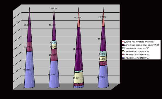 Доля лизинговых платежей по договорам лизинга с УНП в общем объеме лизинговых платежей составляет в среднем за 2004 г-2006 г.41,5% (См. Рис.17).